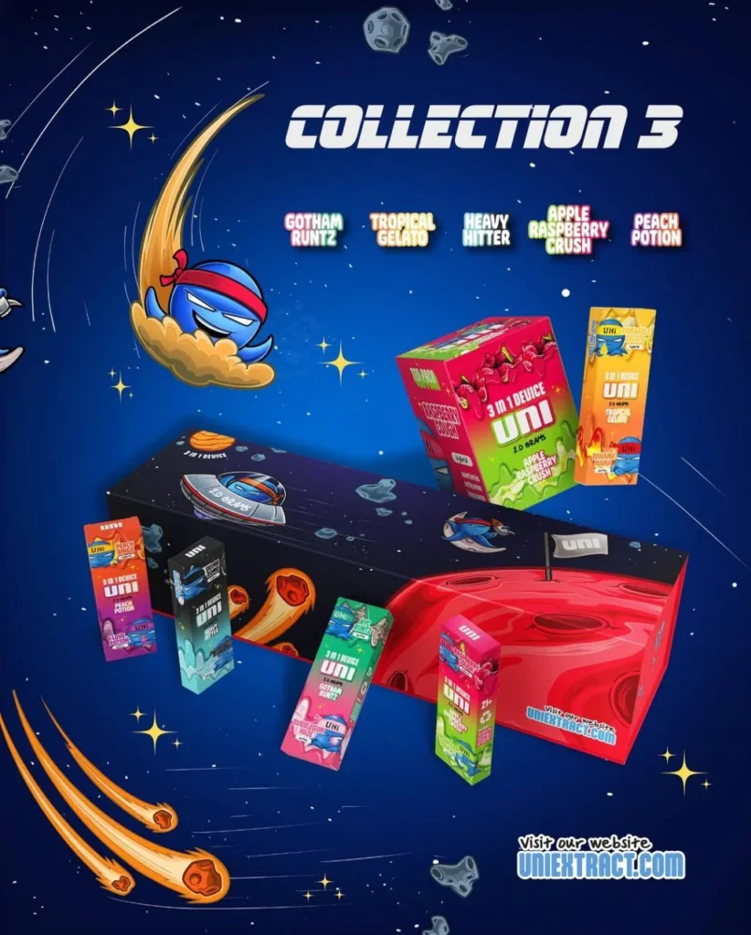 Uni Disposable is an innovative 3-in-1 live resin disposable device that offers flexibility and a premium vaping experience. Featuring three distinct flavor collections, uni 2g disposable reflects our dedication to produce vapes designed for unparalleled portability, rich flavors, and smooth pulls. With a mission to supply clean, full-spectrum cannabis extracts, we strive to redefine the cannabis landscape. With each puff, our elegant, high-performing disposables provide a fresh, refined experience, regardless of your level of experience.